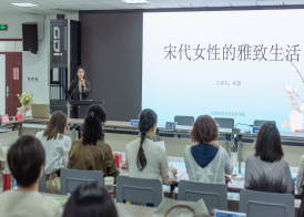 美术学院教师祁慧博士为来宾作“宋代女性的雅致生活的学术报告”。祁慧从绘画图像出发,以女性独特的视觉从服饰冠帽、清玩雅赏、起居环境、饮食用品、日常消遣方式等方面立体化、沉浸式感受了宋代女性的雅致生活。女企业家们全程被讲座吸引,听得津津有味,表示受益良多,并希望美术学院今后多多举办此类活动。活动期间,美术学院师生现场制作的咖啡和果酒,赠送给企业家们的文创产品,都让每一位企业家切身地感受到了美术学院的特色与魅力。