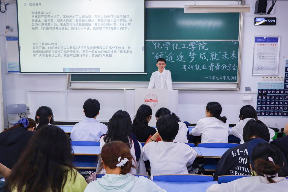 5月14日,化学化工学院举办2025年就业考研青春分享会。活动以“‘研’途逐梦,成‘就’未来”为主题,通过9名在校生线下交流和1名往届参加西部计划的校友线上分享,全方位、多角度与同学们畅谈青春感悟。100余名同学参加分享会。