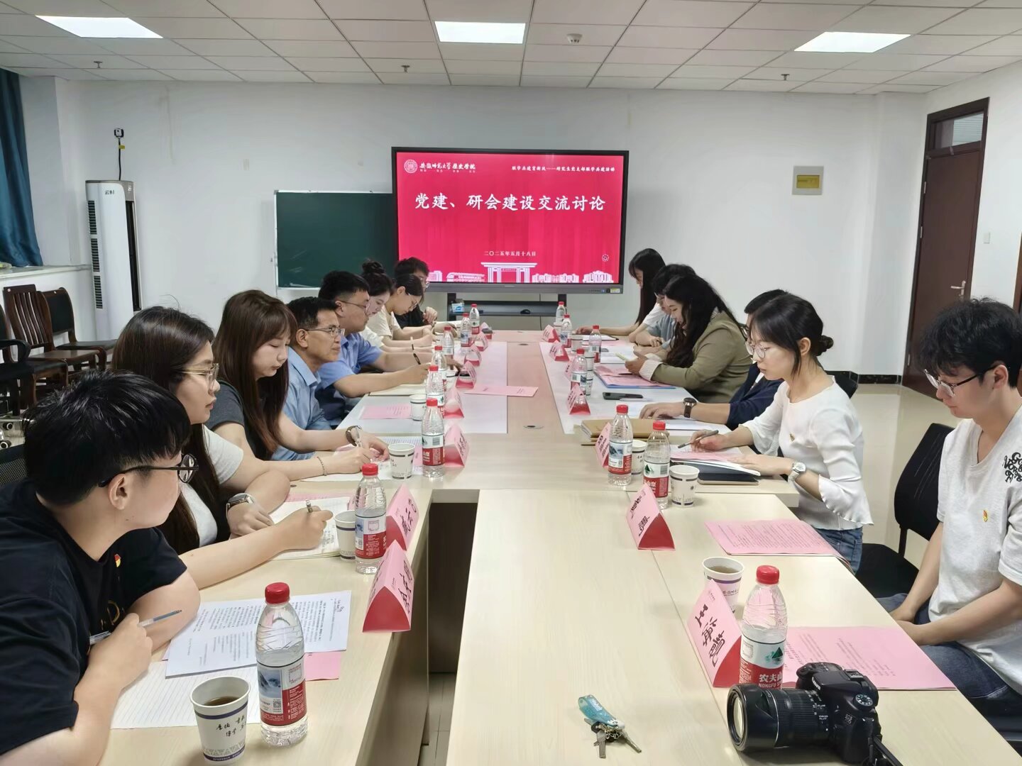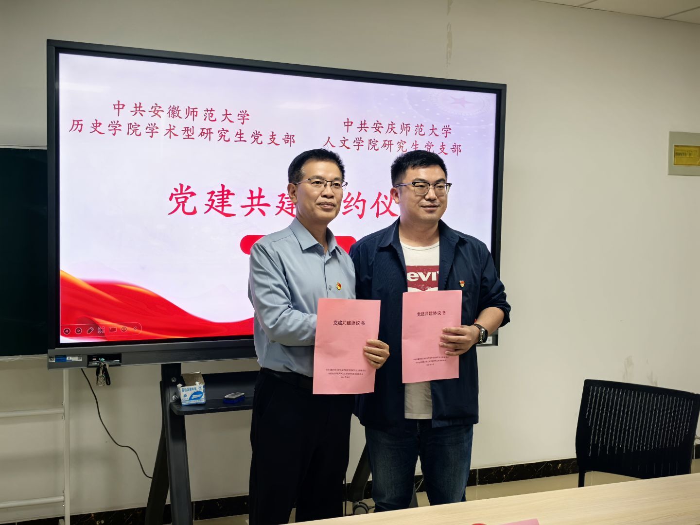 三个党支部以“党建引领促进研究生育人高质量发展”为主题展开,与会各党支部就深入贯彻中央八项规定精神学习教育开展情况、样板支部建设、党建品牌建设、党员示范作用发挥等内容进行了深度交流。交流期间,人文学院研究生党支部与安徽师范大学历史学院学术型研究生党支部共同签署了支部共建协议,人文学院研究生党支部还向5月入党的党员同志发放了政治生日贺卡。
