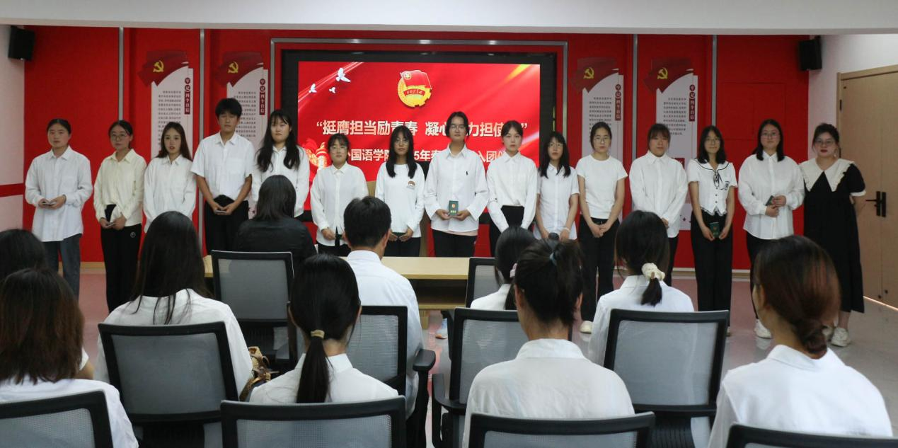 外国语学院团委负责人宣布新团员名单,并向新团员颁发团员证和团徽。入团介绍人代表宣读有关团员义务和权利的条款,帮助新团员明确自身应尽的职责与享有的权利。