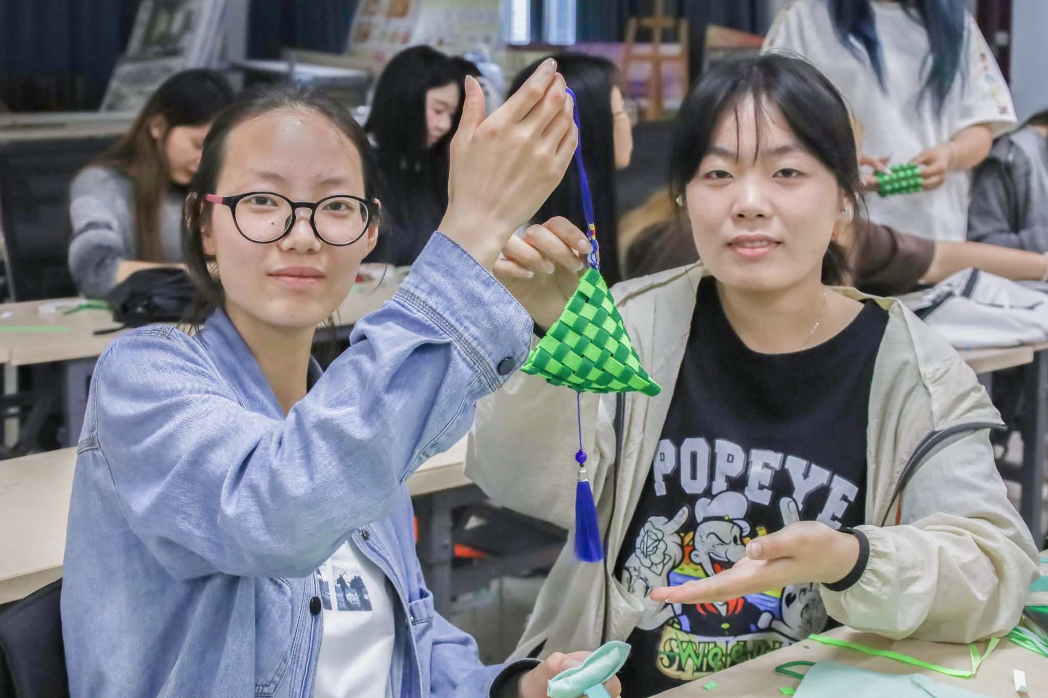 铺布、裁剪、编织、填充艾草、缀上流苏……美术学专业2024(3)班的童瑶与搭档默契协作,指尖流转间,两只精巧别致的布艺粽子香囊逐渐成型。“我们特意选用象征粽叶的绿布,填充具有祛病祈福寓意的艾草,”童瑶托着作品介绍,“小小香囊,浓缩的是端午习俗中驱邪避疫、祈愿安康的深厚文化内涵。它不仅是节日的点缀,更是我们传递文化薪火的‘信物’。”