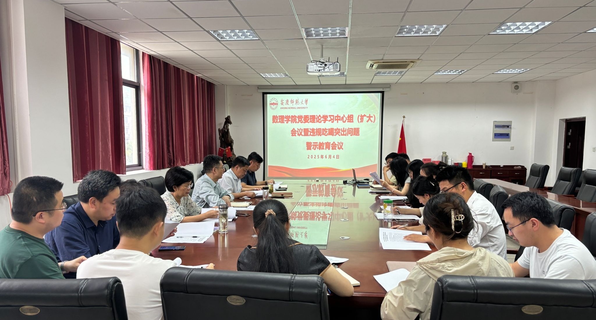 6月4日,数理学院召开党委理论学习中心组(扩大)会议暨违规吃喝问题警示教育会议,全体党委委员、纪委委员、党支部书记、各办公室负责人参加会议。数理学院党委书记陆健主持会议。