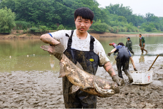 在捕捞区,在捕鱼师傅的指导下,学生们三人一组,双手一扬,渔网稳稳投入水中,鲜鱼落入渔网时还在不断挣扎,朝学生们身上溅上一片片泥渍与水花。