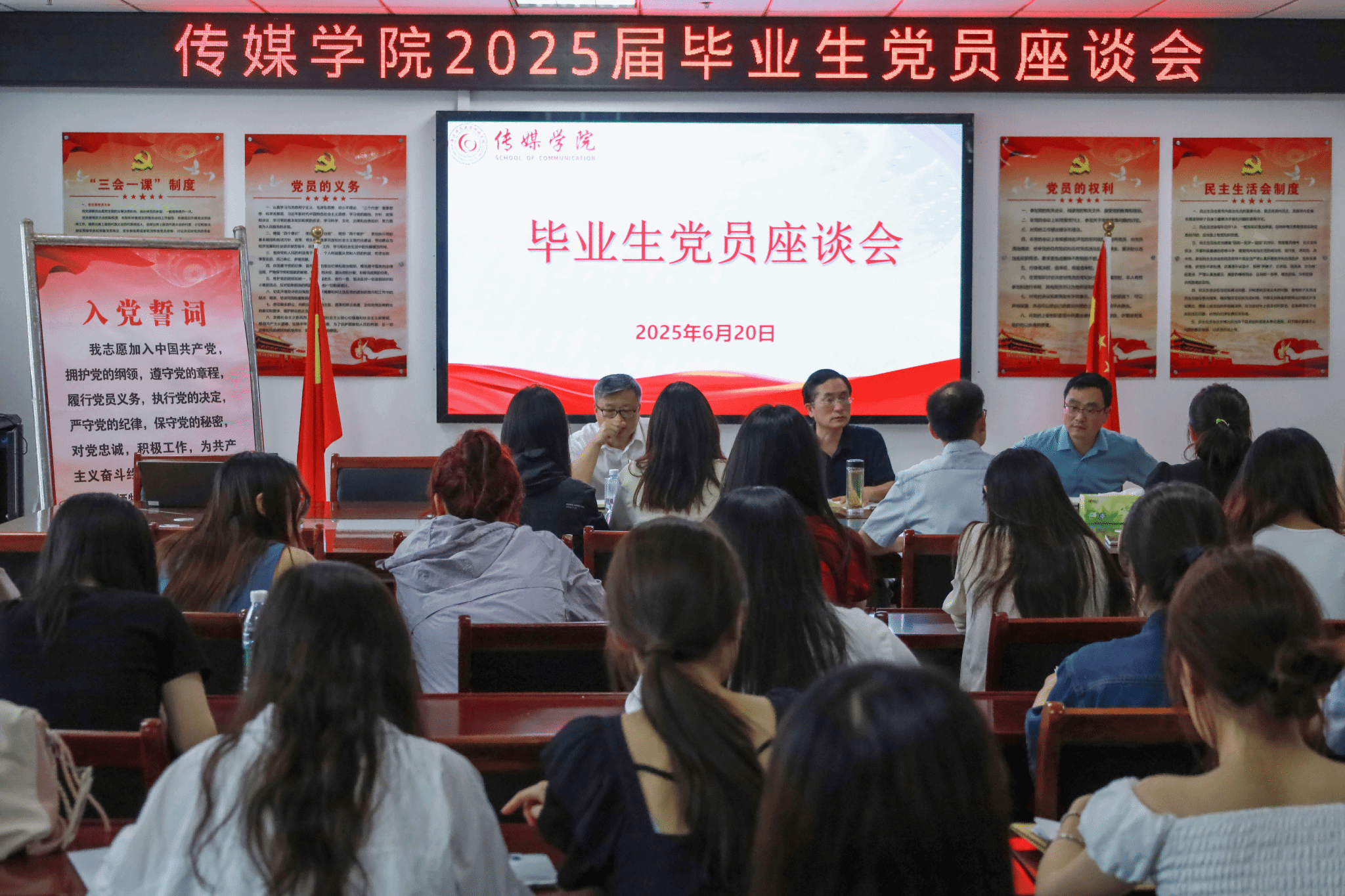 6月20日,传媒学院举办毕业生党员座谈会。传媒学院党委书记詹德全、执行院长王业明、副院长文继奎出席会议。全体学生党支部书记、全体毕业生党员参加会议,党委书记詹德全主持座谈会。