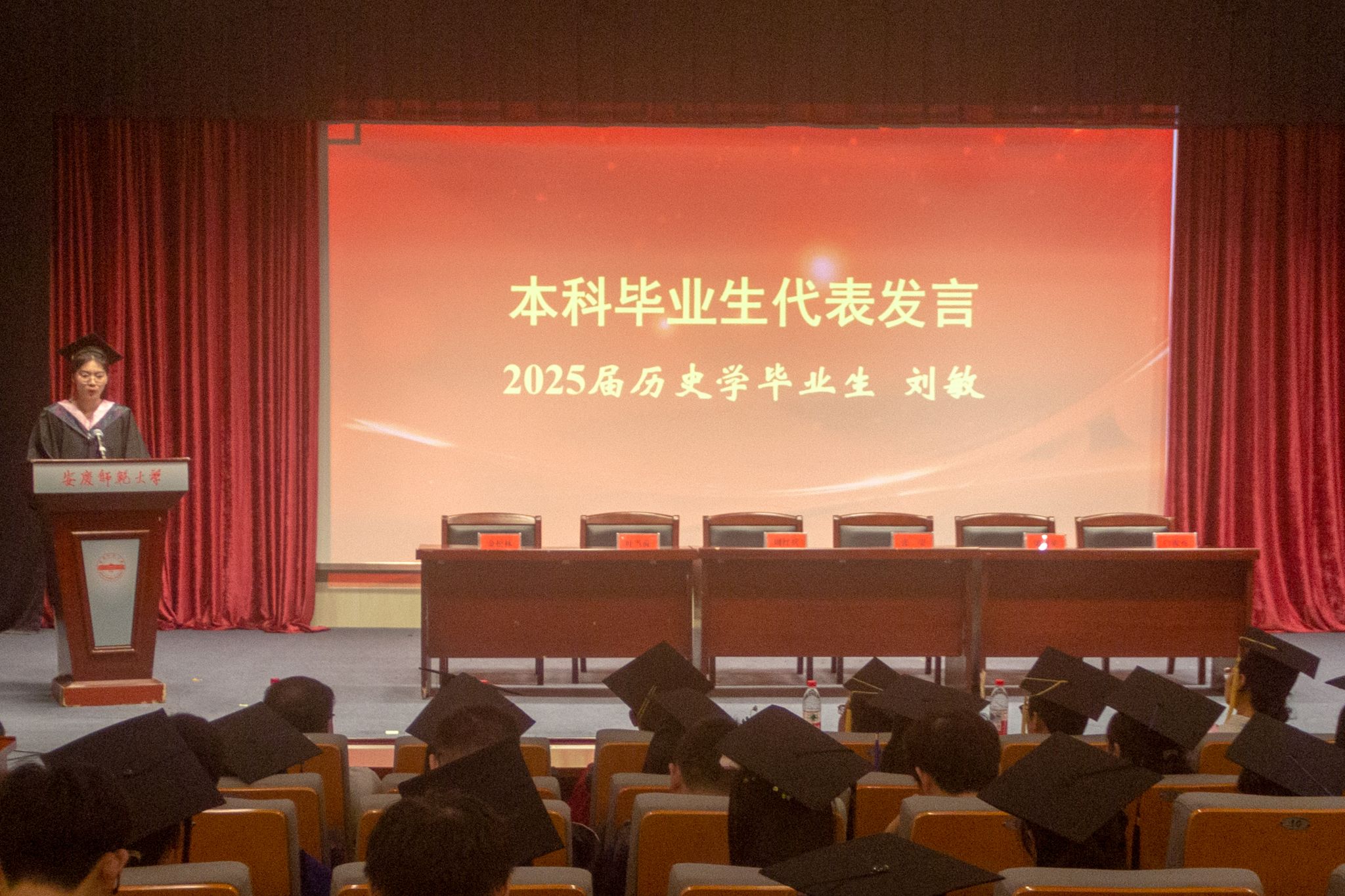 毕业生代表,2021级历史学3班刘敏分享了大学四年从青涩懵懂到矢志追梦的蜕变历程,号召同学们“在文史典籍中寻找生命坐标”;2022 级中国语言文学硕士田家新用“五次失利仍不放弃,第六次终获成功”的成长经历,诠释了“坚定追求”的意义。