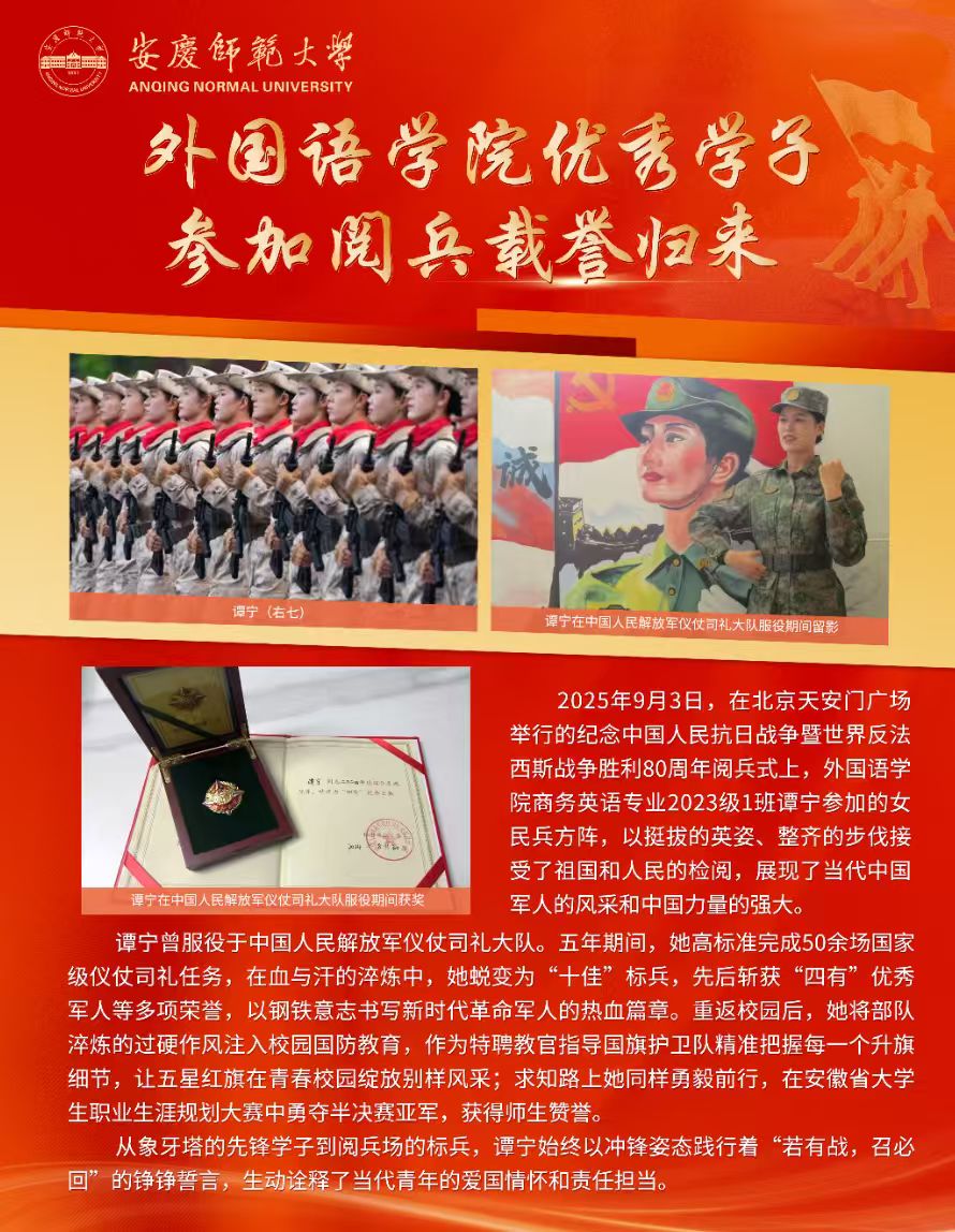 外国语学院将思想政治教育与爱国主义教育融入迎新环节,将商务英语2023级专业(1)班谭宁同学参加“9·3”大阅兵的光荣事迹以图文并茂的形式制成专题展板,生动展现外国语学院学子昂扬向上的精神风貌。展板内容包括在天安门广场受阅瞬间、在中国人民解放军仪仗司礼大队服役期间的经历及所获荣誉等。谭宁表示,军队经历培养了她的纪律性和责任感,而校园生活则给予她专业知识和综合素养;她希望将来能发挥语言专业优势,结合军队经验,在外事交流或国际传播领域为国家作出贡献。
