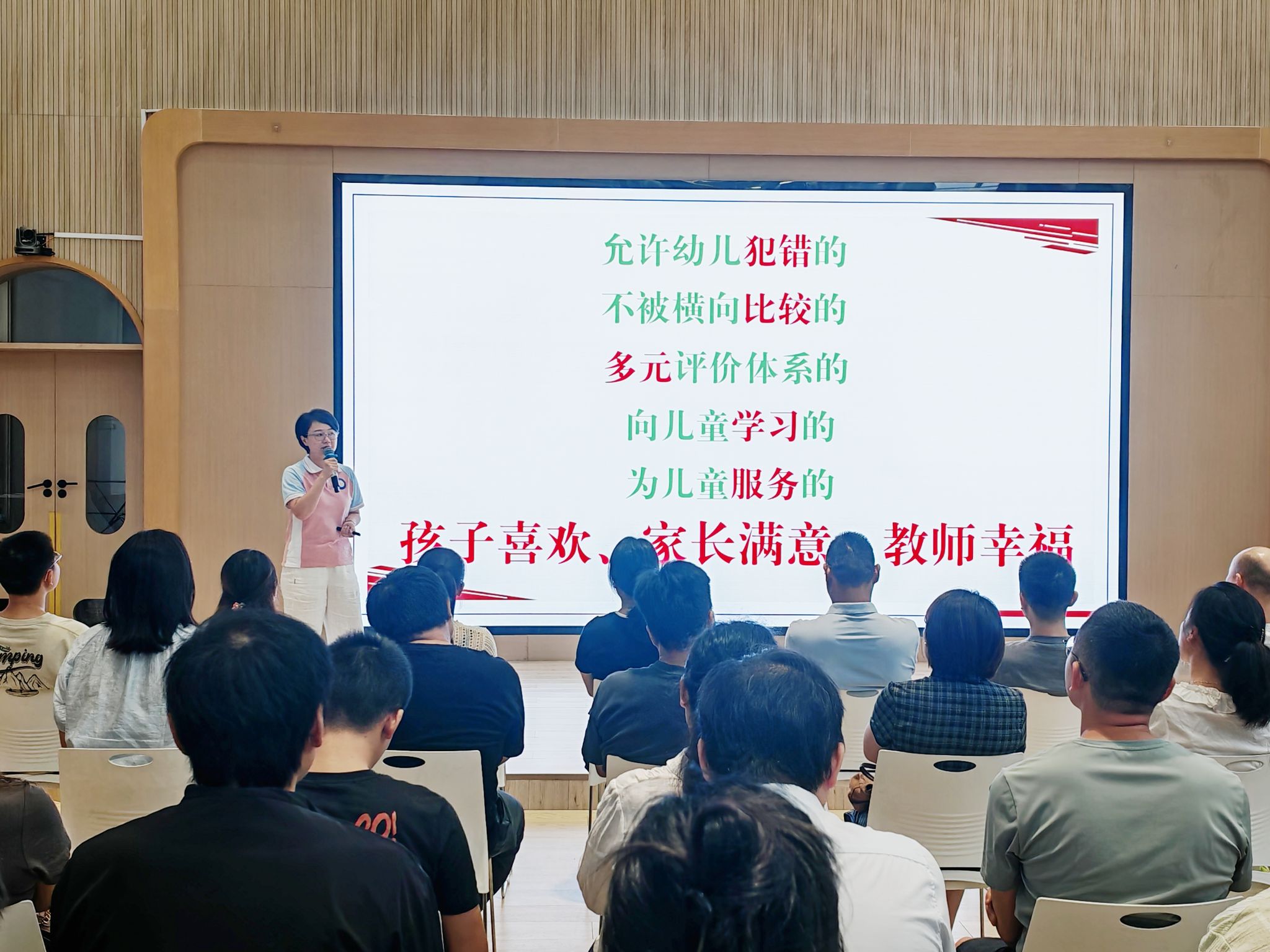 党支部书记、园长姚萍以《让成长在守护中自然发光》为主题,与新生家长围绕“如何培养面向未来的儿童”展开交流。她从幼儿园教育实践与家园共育两方面出发,结合当前教育发展趋势,强调关注儿童全面发展,重视实践操作与创新思维培养,并系统介绍了幼儿园整体情况、师资力量以及以“起舒”文化为特色的生活、科学、运动课程体系。