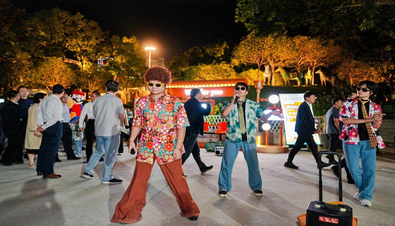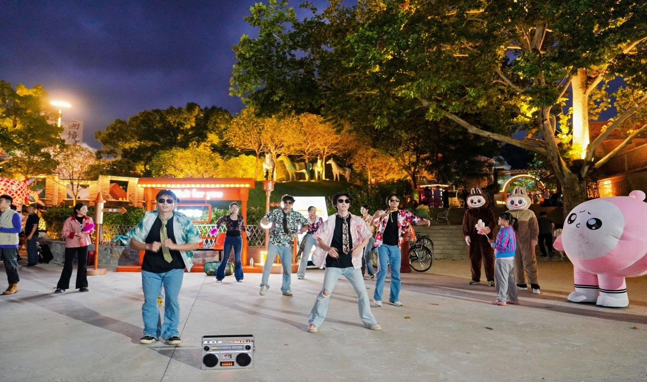 围绕集贤时空的复古基调,音乐学院学生精心策划了“时空年代巡演”主题演出。舞蹈节目选取了《路灯下的小姑娘》《夜上海》《莎啦啦》《冬天里的一把火》等经典曲目,演员们身着二十世纪八十年代标志性的迪斯科服装,肩扛老式收音机,骑着二八大杠自行车,车上载满铁皮青蛙、泡泡胶等复古玩具,瞬间将观众带入往昔岁月。歌曲演绎环节,小虎队的《爱》、闽南语金曲《爱情才会赢》等旋律响起,引发全场共鸣。此外,跳皮筋、跳房子、丢沙包等互动游戏更是吸引游客踊跃参与,同学们将玩具作为奖励赠送,现场气氛热烈,欢声笑语不断。