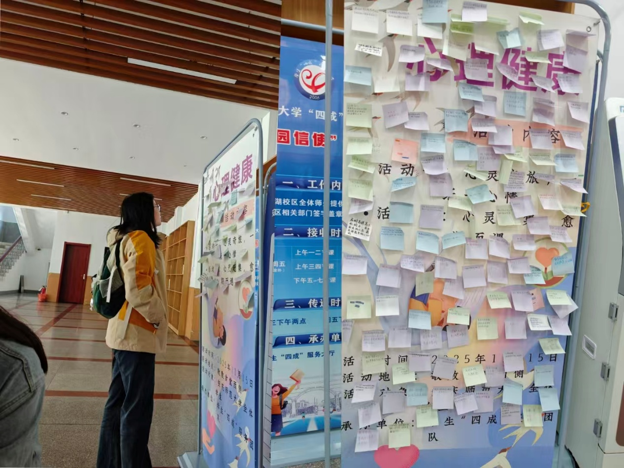 转瞬之间,海报上便布满了色彩斑斓的“心情印记”,汇聚成一幅展现当代大学生丰富内心世界的生动画卷。同学们或驻足沉思,认真品读他人的感悟;或拍照留念,记录这一温馨时刻。该活动通过书写与静思等方式,有效帮助参与者完成了一次与自我深度对话的奇妙旅程。