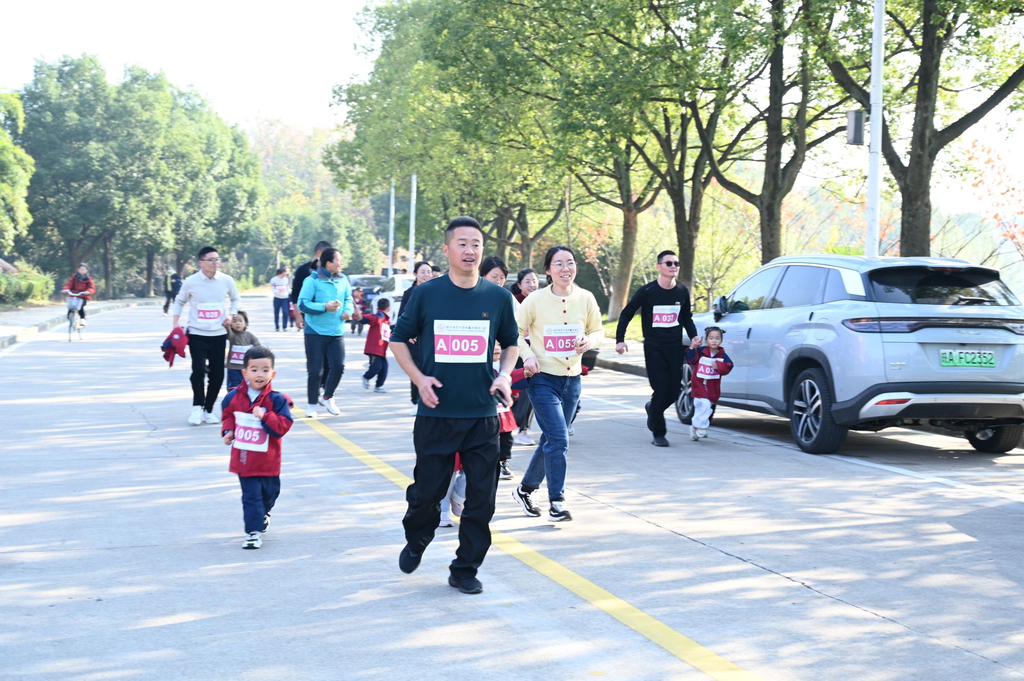 随着一声清脆的口哨声,亲子迷你马拉松比赛正式开跑。环湖赛道上,一个个奔跑的身影成为了最亮丽的风景线:孩子们迈着坚定的步伐,家长们耐心陪伴在侧,时而牵手鼓励,时而弯腰叮嘱。赛道上不仅有自信的步伐、坚毅的眼神、欢快的笑声,更有亲子间相互陪伴的温馨画面,每一个瞬间都彰显着“永不放弃”的初心。