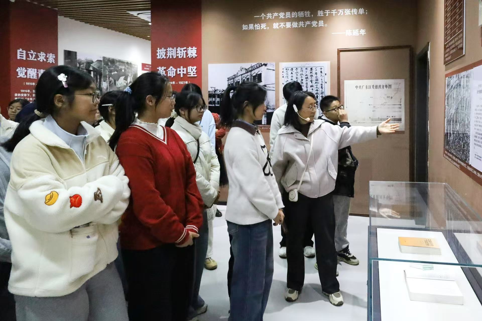 步入延乔书屋,“这盛世如你所愿”七个大字映入眼帘,引发师生驻足深思。在讲解员程先莲老师的引导下,师生们依次参观了“故里启蒙”“自立求索”“披荆斩棘”“慷慨就义”四个主题展区。展览通过珍贵的历史图片、文献与实物,生动再现了陈延年、陈乔年烈士短暂而光辉的一生,讴歌了早期共产党人坚定的理想信念与无畏牺牲精神。