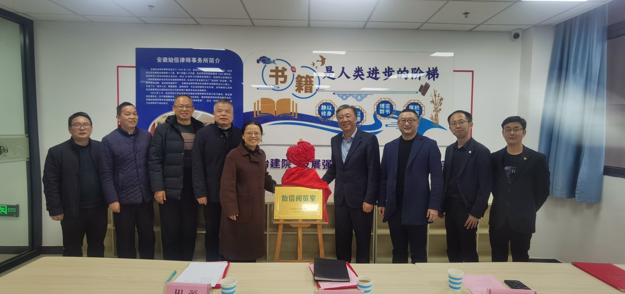 12月3日下午,法学院与安徽始信律师事务所协同育人平台——“始信阅览室”揭牌仪式在法学院四楼举行。学校1985届校友、安徽始信律师事务所主任刘鹰,律所高级合伙人、党支部书记唐开发,律所刑事业务部主任、2014届校友田源以及专职律师刘斌等一行四人返校参会,学校校友会秘书长王开友,法学院党委书记、校友分会会长钱敏,法学院副院长崔汪卫,党委副书记卫功兵,法学院副院长邱少晖,法学院教学秘书、校友分会秘书长李丹及师生代表共30余人参加。仪式由卫功兵主持。