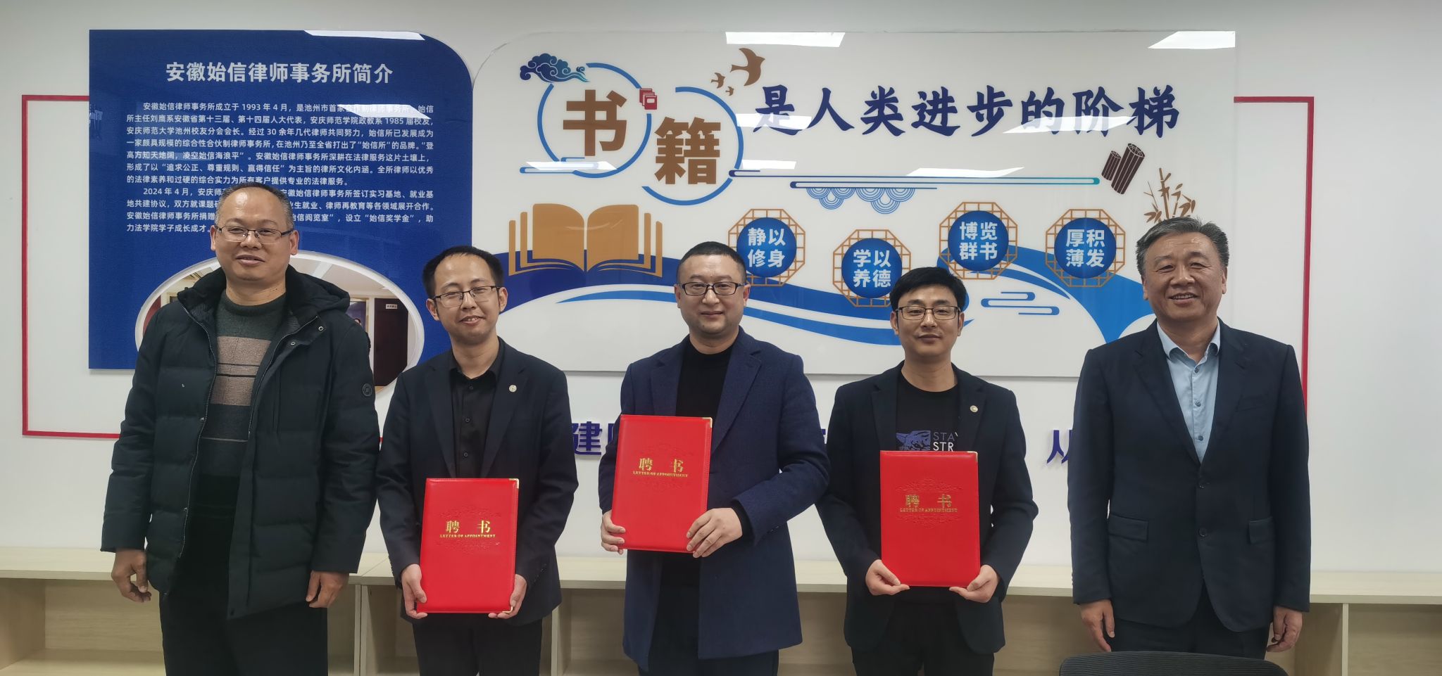 会上,举行了“始信阅览室”揭牌仪式及“客座教授”受聘仪式。崔汪卫为唐开发、王旻、田源三位律师颁发聘书,希望其以实务经验助力法科生实践能力提升。卫功兵代表学院对刘鹰校友一行返校表示欢迎,对始信律所长期以来在学科建设、人才培养等方面的支持致以诚挚感谢。