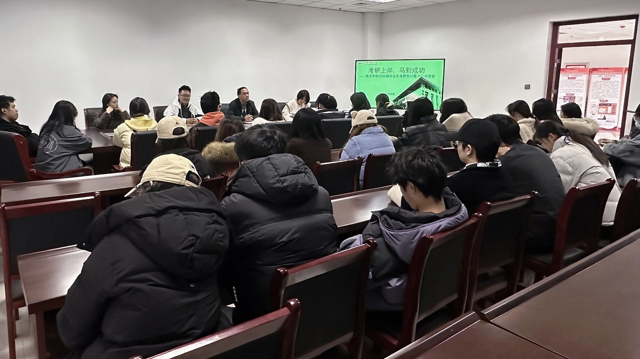 12月10日,美术学院举办“考研上岸,马到成功——2026届毕业生考研慰问暨冲刺动员会”,美术学院党委副书记金忠良、全体毕业班辅导员、就业秘书和2026届毕业生考研学子参加了会议,会议由金忠良主持。