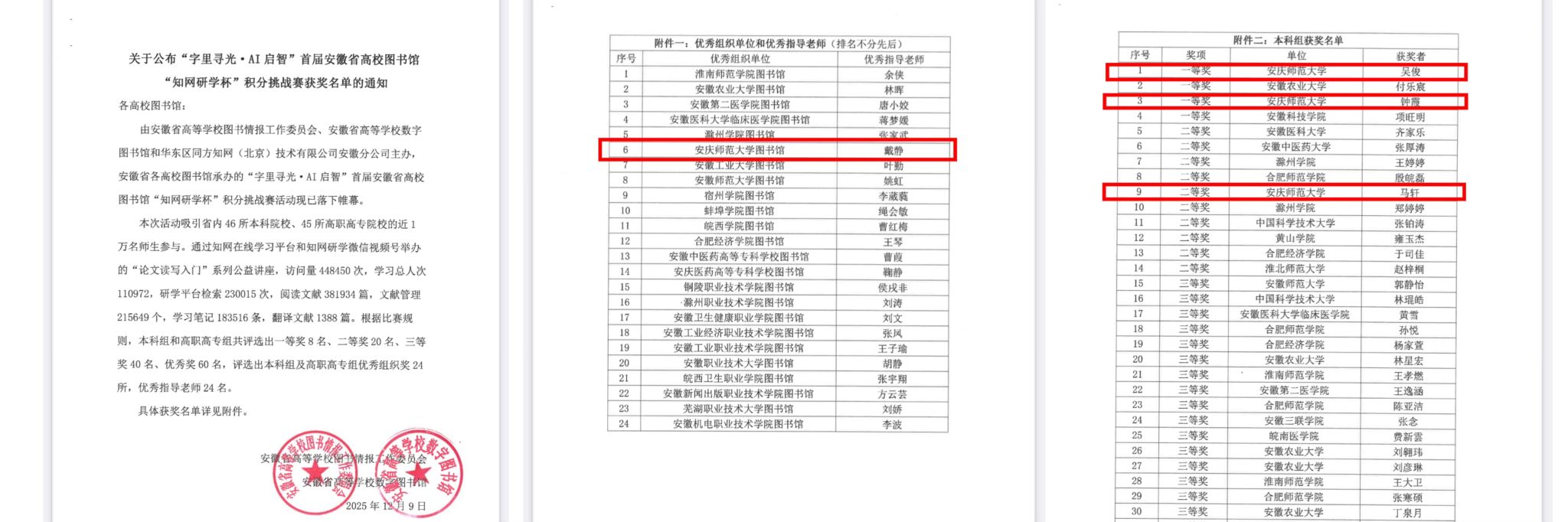 近日,“字里寻光·AI启智”首届安徽省高校图书馆“知网研学杯”积分挑战赛圆满落幕。本次大赛中,法学院吴俊、钟霞同学获一等奖,教育科学学院马轩同学获二等奖,在此次比赛中beat365官网参赛人数和获奖成绩在全省各院校中均居前列,图书馆获得“优秀组织单位”奖。