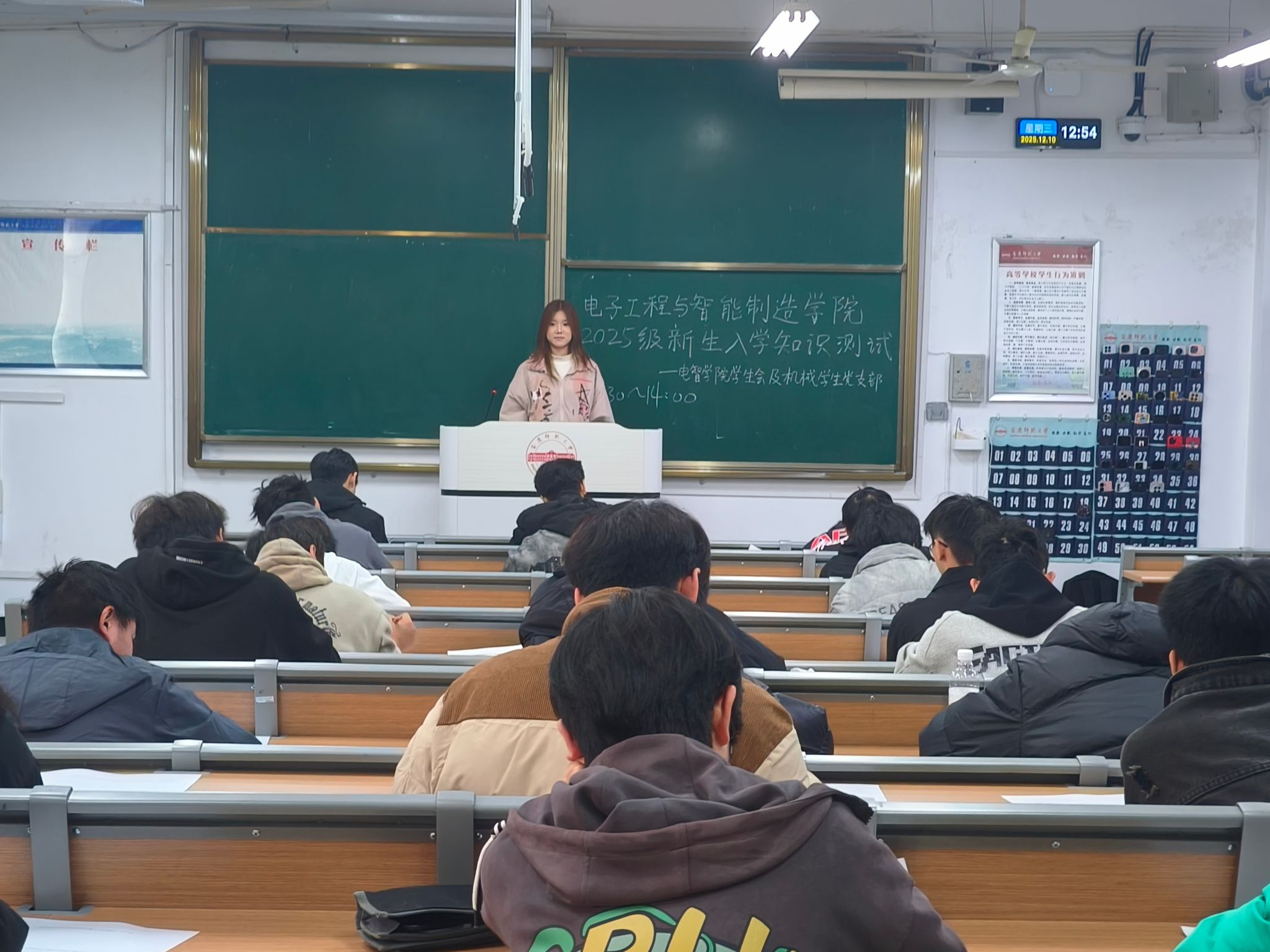 12月10日,电子工程与智能制造学院集中组织开展2025级新生入学知识测试。学院党委副书记高栋梁及全体新生辅导员担任巡考,各学生党支部预备党员、发展对象以及团委学生骨干负责监考。