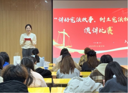 12月10日,法学院开展“讲好宪法故事,树立宪法权威”主题演讲比赛。参赛选手们精神饱满、神采飞扬,结合自身成长经历、社会热点事件以及对宪法条文的深刻理解,用真挚的情感和生动的语言,讲述了一个个关于宪法如何保障公民权利、如何引领社会进步的鲜活故事。同学们声情并茂的演讲,不仅表达了对宪法的尊崇与热爱,更展现了新时代青年学生维护宪法尊严、弘扬法治精神的坚定决心,赢得了现场观众的阵阵掌声。