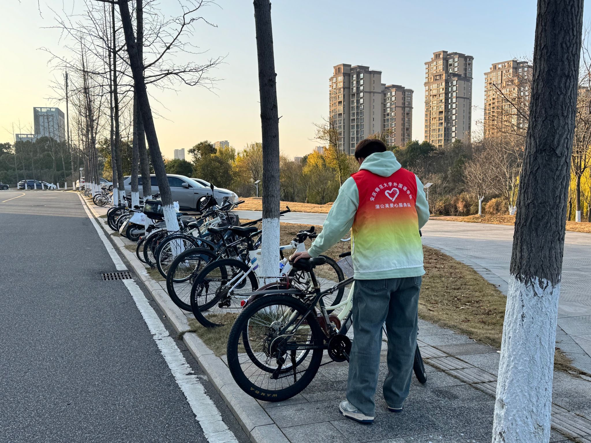 规范摆放显文明。针对外国语学院楼前自行车停放区域存在的车辆摆放随意、占用通道等问题,负责车辆规范整理的同学们耐心细致地逐一挪动、对齐,将自行车引导至指定区域有序停放。他们的精心付出,使原本杂乱的停车区变得井然有序,有效改善了楼宇周边的环境面貌,保障了通行安全与顺畅。这一行动不仅是简单的体力劳动,更是公共秩序维护、规则意识养成的生动实践,引导学生在服务校园、服务师生的具体实践中提升思想道德素养。