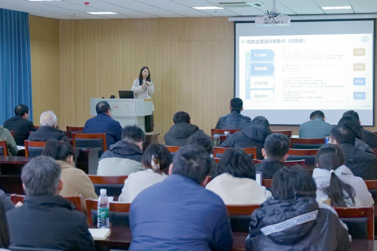 会上,朱盈盈博士围绕中国国际大学生创新大赛的备赛全流程,聚焦核心环节进行了系统阐述与深度解读。她首先梳理了大赛的赛事背景、办赛初衷与整体定位,明确了参赛范围与认知框架,并以“顶天”“立地”四字箴言点明优质选题方向。随后, 朱博士精准解读了高教主赛道、“青年红色筑梦之旅”赛道及产业赛道的评审规则与考察重点。在案例剖析环节,她结合往年金奖项目,拆解其在创新性、可行性、社会价值和团队协作等方面的成功要素,系统阐述从备赛到国赛的完整历程。最后,朱博士以一系列的“路线图”,引导师生逐步明确从组队、选题、材料撰写到现场答辩各阶段的关键任务与实用技巧,为备赛之路提供了具体而有力的指引。