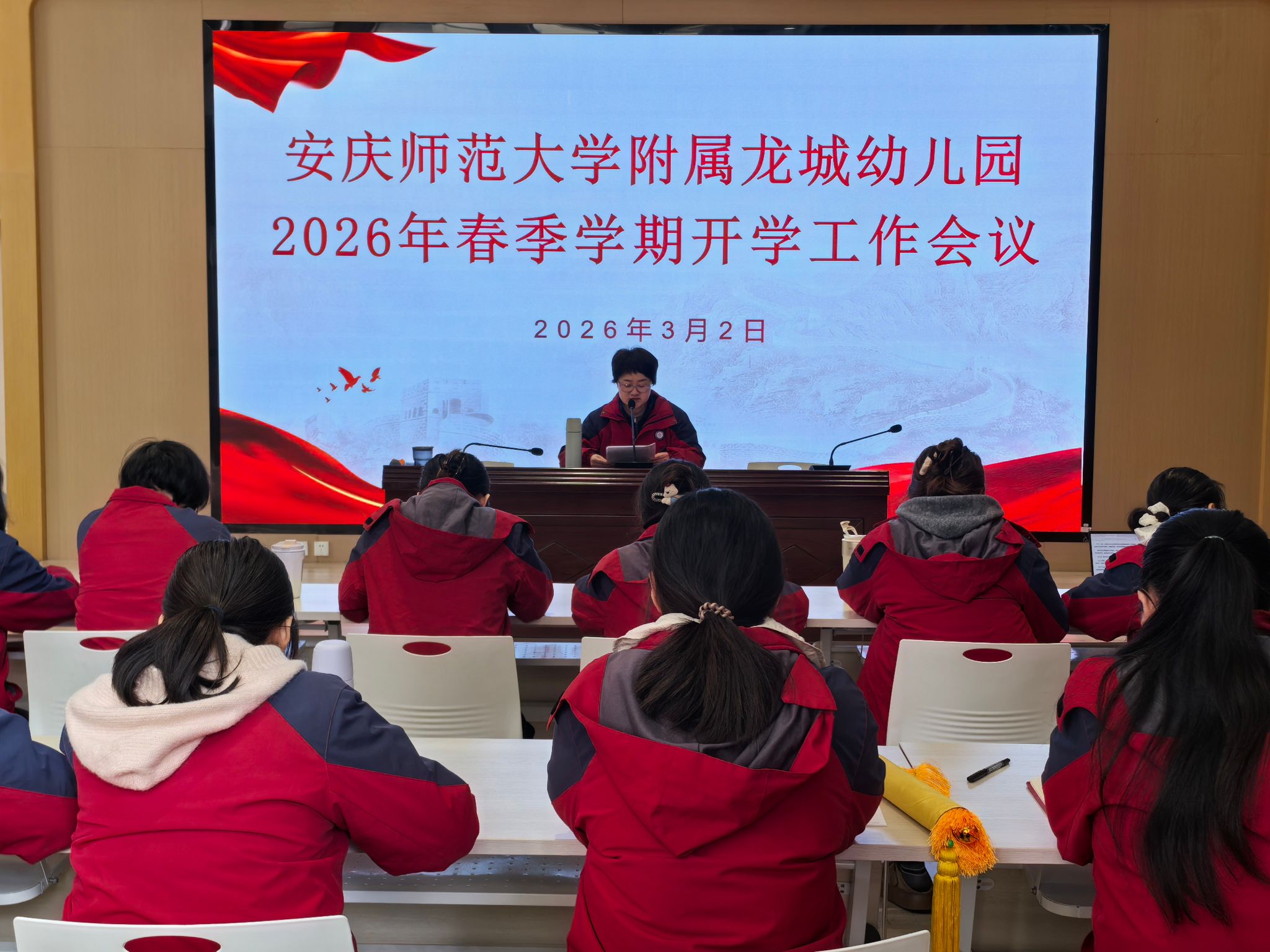 3月2日,附属龙城幼儿园召开2026年春季学期开学工作会议暨师德师风专题会议,全体教职工参加会议。