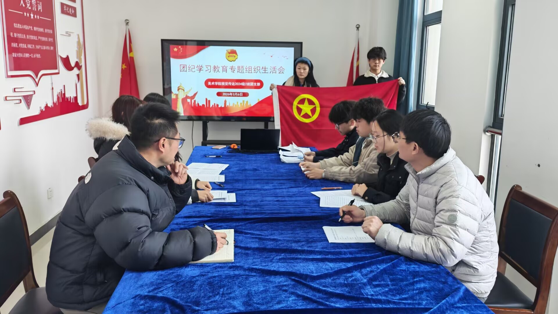 会议最后,全体团员起立,齐唱《中国共产主义青年团团歌》,激昂的旋律凝聚起青春奋进的力量,让每一位团员在歌声中重温入团初心、感悟责任担当。随后,全体团员面向团旗,高举右拳,庄严重温入团誓词,铿锵有力的誓言回荡在会场,彰显了新时代青年团员听党话、跟党走的坚定决心。