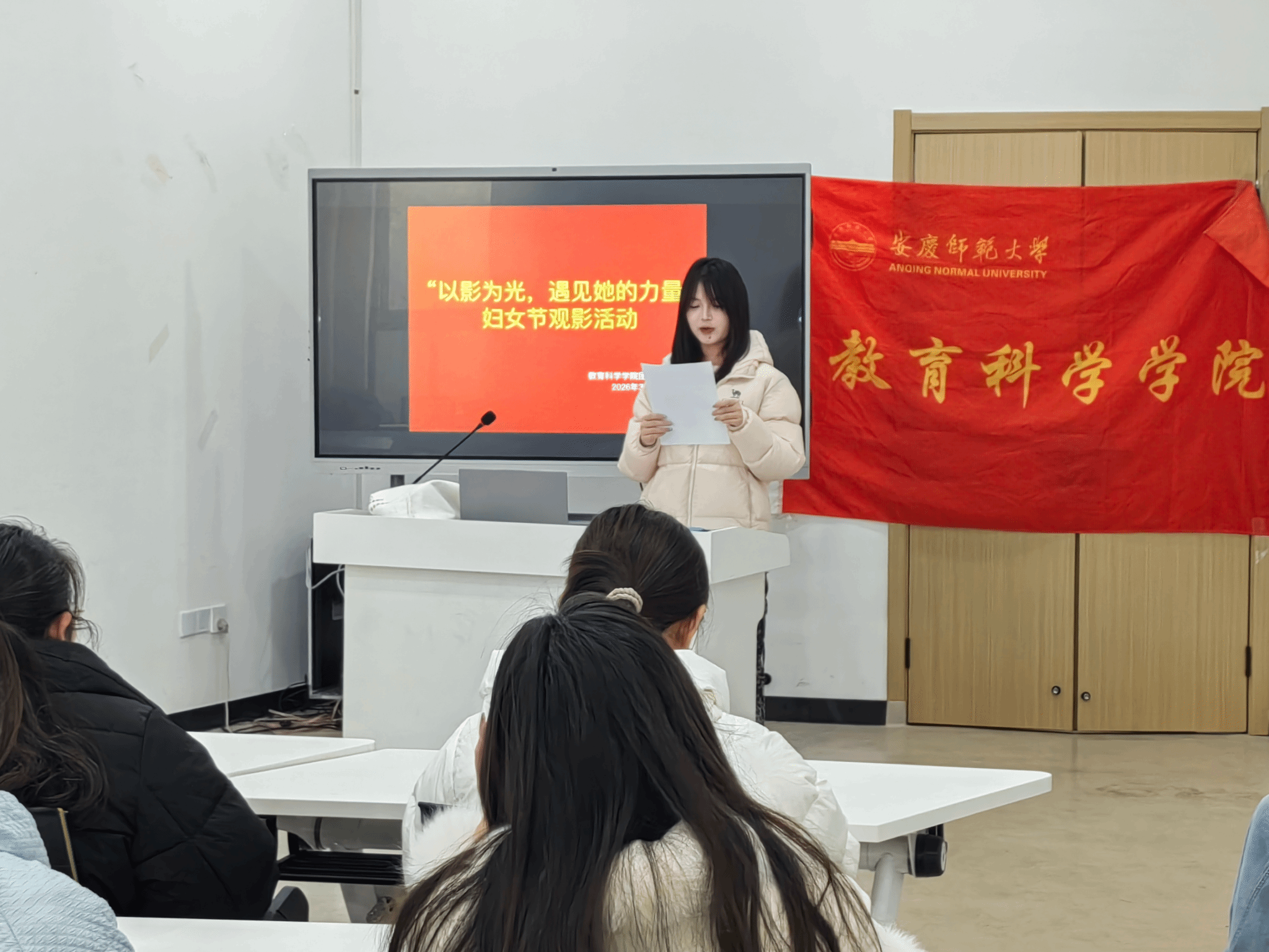 3月8日,教育科学学院于一站式学生社区美育活动室开展“以影为光,遇见她的力量”妇女节观影活动。活动由主席团主席助理郜雨蒙主持,学院学子积极参加。