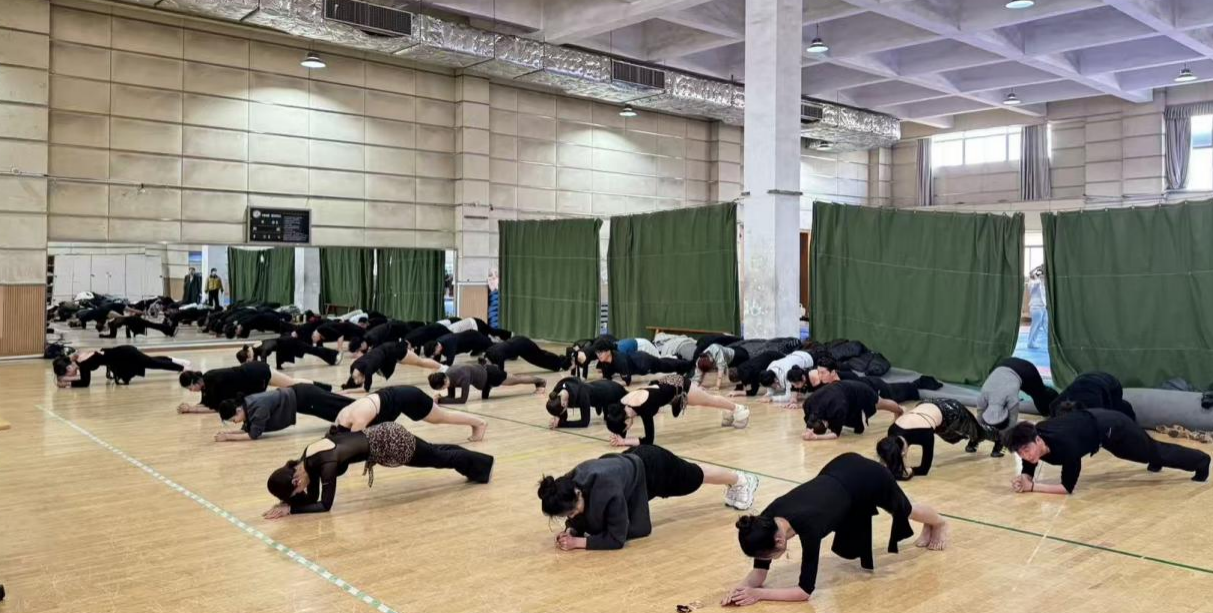 本次选拔面向学院表演、舞蹈表演专业全日制在校本科生及研究生,吸引了众多基本功扎实、技艺精湛的学生踊跃报名。选拔内容涵盖形体姿态与基本步、套路展示及体能测试三大环节,全面考察选手的专业素养与综合能力。参选学生统一身着黑色舞蹈服,以饱满的精神状态展示了伦巴基本步、自编套路及波比跳、平板支撑等项目。