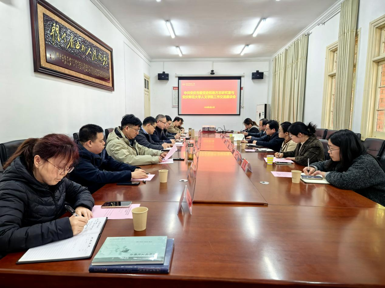 3月13日,人文学院与安庆市委党史和地方志研究室联合举办合作交流座谈会,扎实开展树立和践行正确政绩观学习教育,深化校地融合发展,推动党史与地方志工作高质量发展。安庆市委史志室主任汪枫林、副主任魏敏、陈庆伟,人文学院院长汪孔丰、党委书记王波以及双方有关科室和科研平台负责人参加座谈会,人文学院副院长沈志富主持会议。