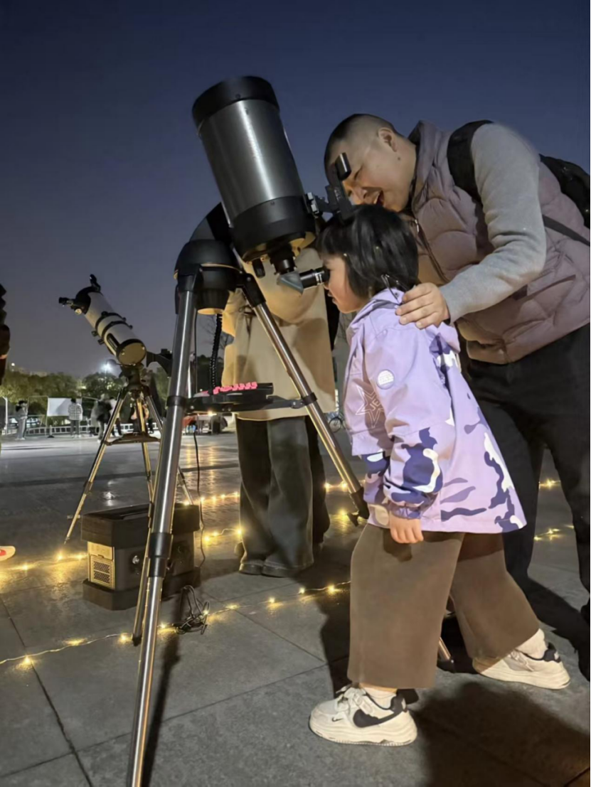 仰望星空,触摸宇宙脉搏。多台专业望远镜整齐列阵,等待着一双双好奇的眼睛。透过镜筒,月球表面古老的环形山近在咫尺,行星的神秘轮廓隐约可见。“为什么月亮会有阴晴圆缺?”“行星和恒星有何不同?”面对同学们的连珠炮发问,志愿者们耐心解答,让高深的天体物理知识化作了指尖可触的惊喜。