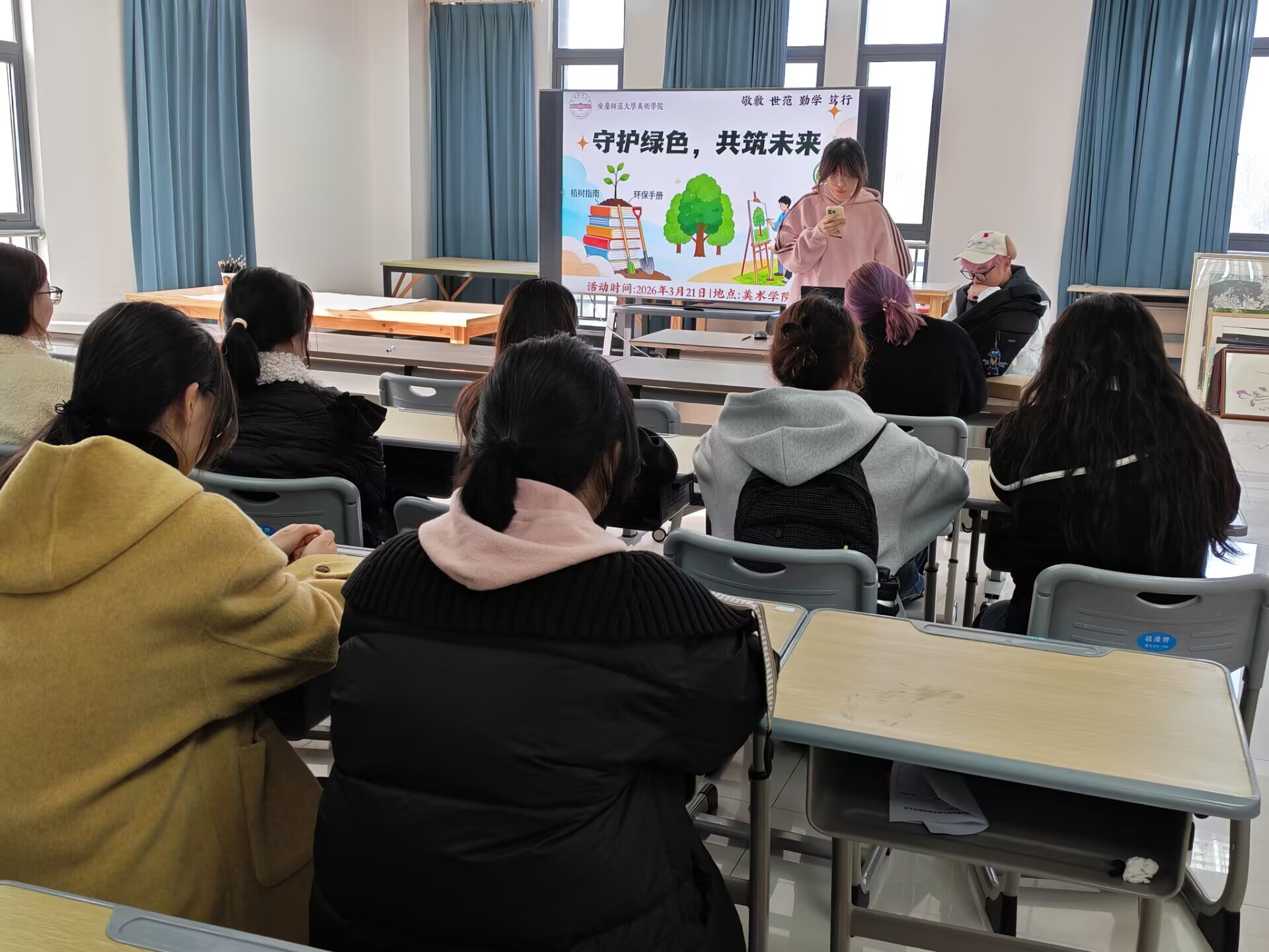 3月21日,在第14个国际森林日到来之际,美术学院“守护绿色,共筑未来”主题活动在美术学院P210教室顺利举办并圆满落幕。本次活动由美术学院学生会学习部精心主办,全院百余名青年学子踊跃参与,创新性采用“生态知识科普+艺术创意创作”的双线形式,将生态文明理念与专业艺术素养深度结合,让绿色环保种子在青年学子心中深深扎根、向阳生长。