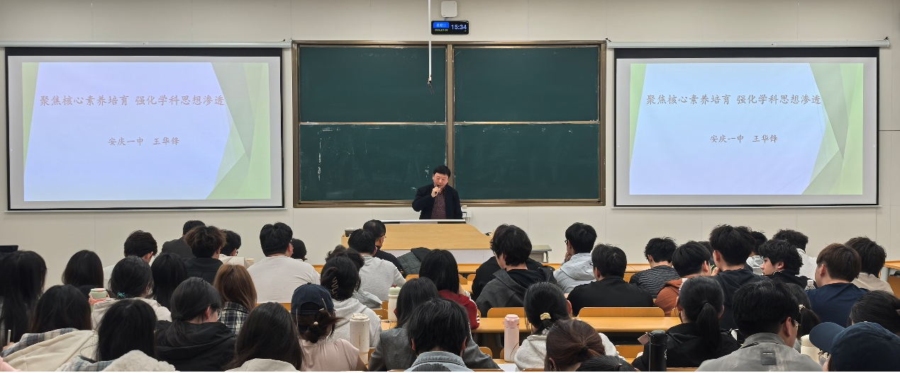 4月8日,化学化工学院在教学楼C208举行2024级化学师范生教育见习系列讲座,深入推进“质量文化年”建设,全面落实学校《关于加强教风建设的十条措施和关于加强学风建设的十条措施》等文件精神,进一步提升化学专业师范生的教学素养与职业能力。邀请安庆一中高级教师王华锋、潘丹丹作专题报告。学院院长王钧伟教授主持报告会,化学专业部分教师、2024级化学专业全体学生参加报告会。