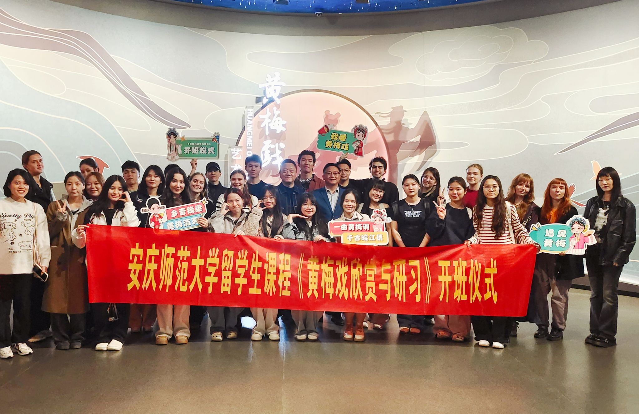 国际教育学院与黄梅剧艺术学院自本学期伊始积极谋划、精心筹备,为留学生打造黄梅戏文化选修课,探索黄梅戏在地国际化传播新路径,深化来华留学生对黄梅戏文化的感知与理解,搭建中外文明交流互鉴的桥梁。经过一个多月的细致筹备,4月11日,《黄梅戏欣赏与研习》课程开班仪式在中国黄梅戏博物馆隆重举行。国际教育学院、黄梅剧艺术学院相关负责人出席仪式,全体选课留学生全程参与。