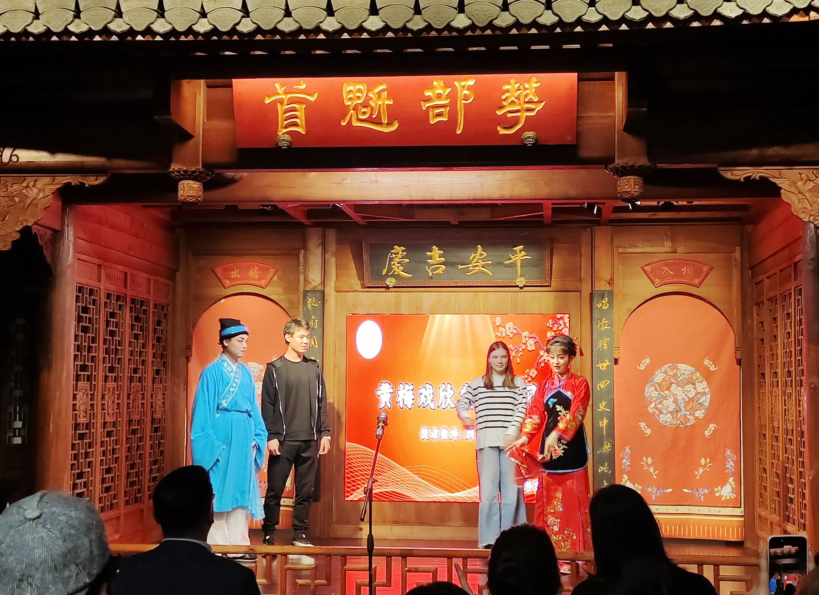 随后,刘国平老师开展了黄梅戏赏析微讲座,用通俗易懂的语言讲解黄梅戏的历史渊源与艺术特色。他邀请黄梅剧艺术学院学生现场演绎黄梅戏经典剧目《闹花灯》,灵动的唱腔、鲜活的表演赢得了留学生们和现场观众的阵阵掌声。表演结束后,刘国平老师针对黄梅戏的经典唱腔、生活化表演场景进行现场指导,带领留学生开展沉浸式体验,让大家亲身感受黄梅戏的独特魅力。仪式尾声,师生们共同参观了中国黄梅戏博物馆,在实物与史料中进一步了解黄梅戏的发展历程。