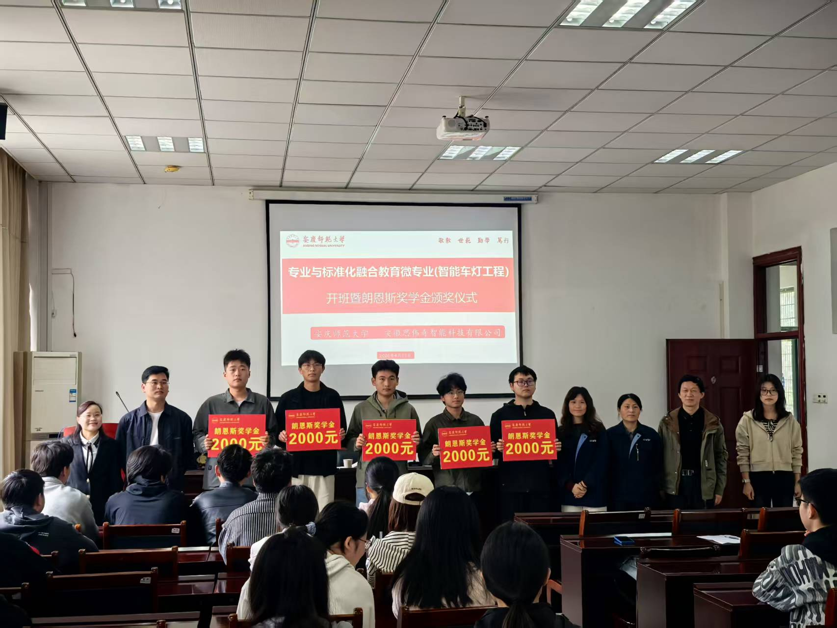 4月17日,学校联合安徽思伟奇智能科技有限公司举办的专业与标准融合教育微专业(智能车灯工程)开班暨朗恩斯奖学金颁奖仪式在稼先楼南104会议室举行。安徽思伟奇智能科技有限公司人事经理谢思霞一行,微专业师生以及奖学金获奖代表出席,仪式由学院副院长詹文法主持。