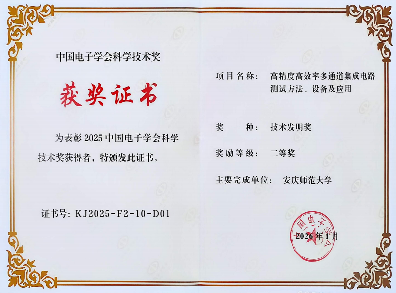 4月19日,中国电子学会正式公布了2025年度中国电子学会科学技术奖评审结果。我院詹文法教授牵头,联合悦芯科技股份有限公司、复旦大学、中国电子科技集团公司第五十八研究所共同完成的“高精度高效率多通道集成电路测试方法、设备及应用”项目,荣获技术发明二等奖。这是beat365官网在集成电路测试技术领域取得的又一标志性成果。