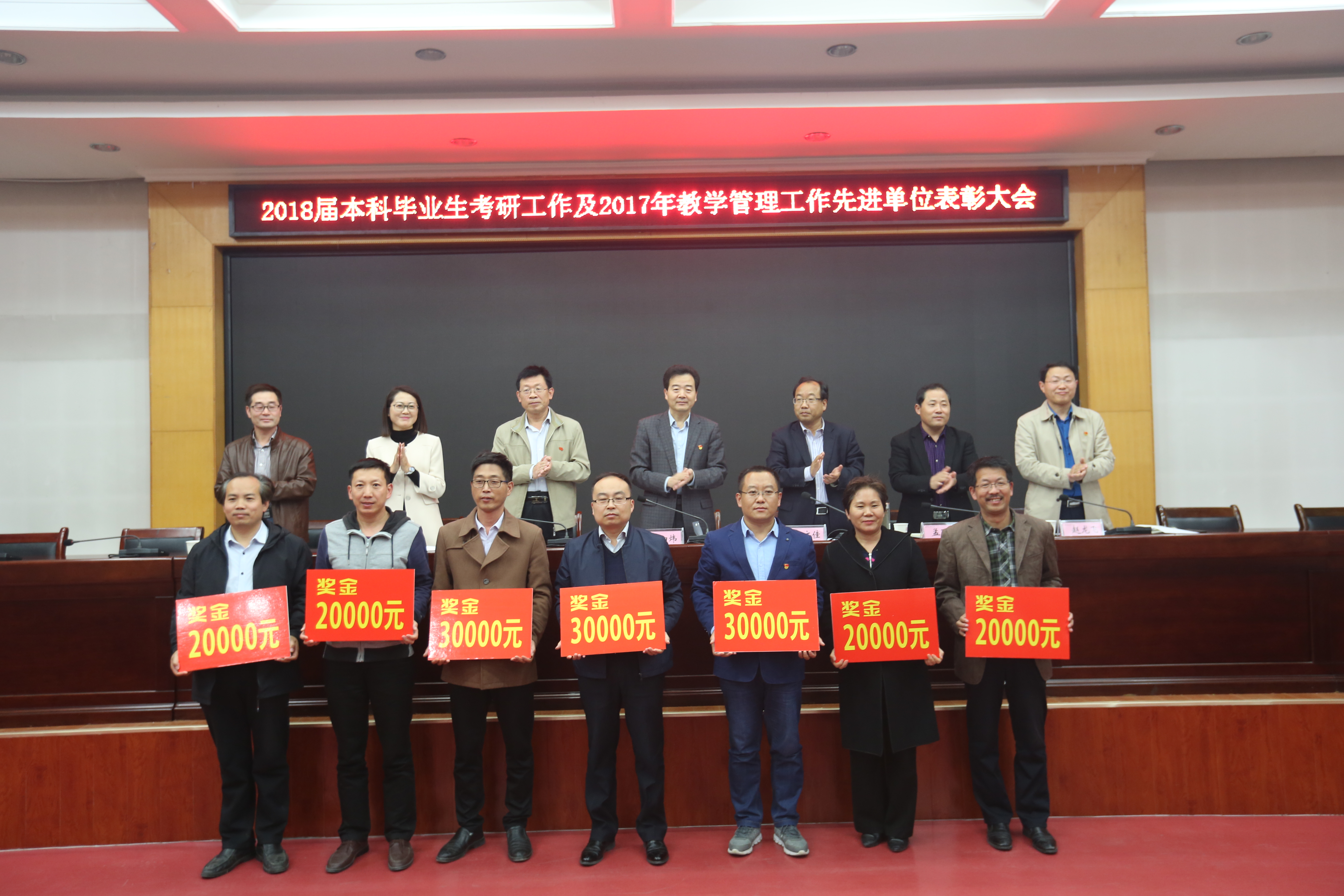 10月26日下午,贝博官网在平原路校区召开了2018届本科考研工作表彰大会。副校长陈向炜、郭文佳出席会议,教务处、学生处、招生与就业处、校团委、教学评价与教师发展中心等部门负责人及各学院院长、副书记、教学副院长、教学办主任、考研辅导教师代表、大四(2019届毕业生)辅导员、大四学生代表参加了此次会议。会议由郭文佳副校长主持。会上, 招生与就业处处长庞永祥宣读了《商丘师范学院关于2018年考研工作先进单位表彰的决定》。副校长陈向炜、郭文佳及与会领导向获奖单位颁发了奖金和奖牌。
