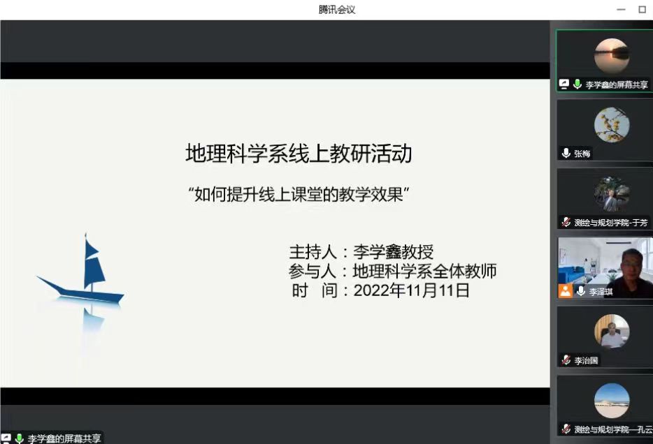 2022年11月11日上午,ballBET贝博BB艾弗森地理科学系召开了“如何提升线上教学效果”专题教研活动会议。会议由系主任李学鑫教授主持,采用线上腾讯会议形式进行,地理科学系全体教师参加。