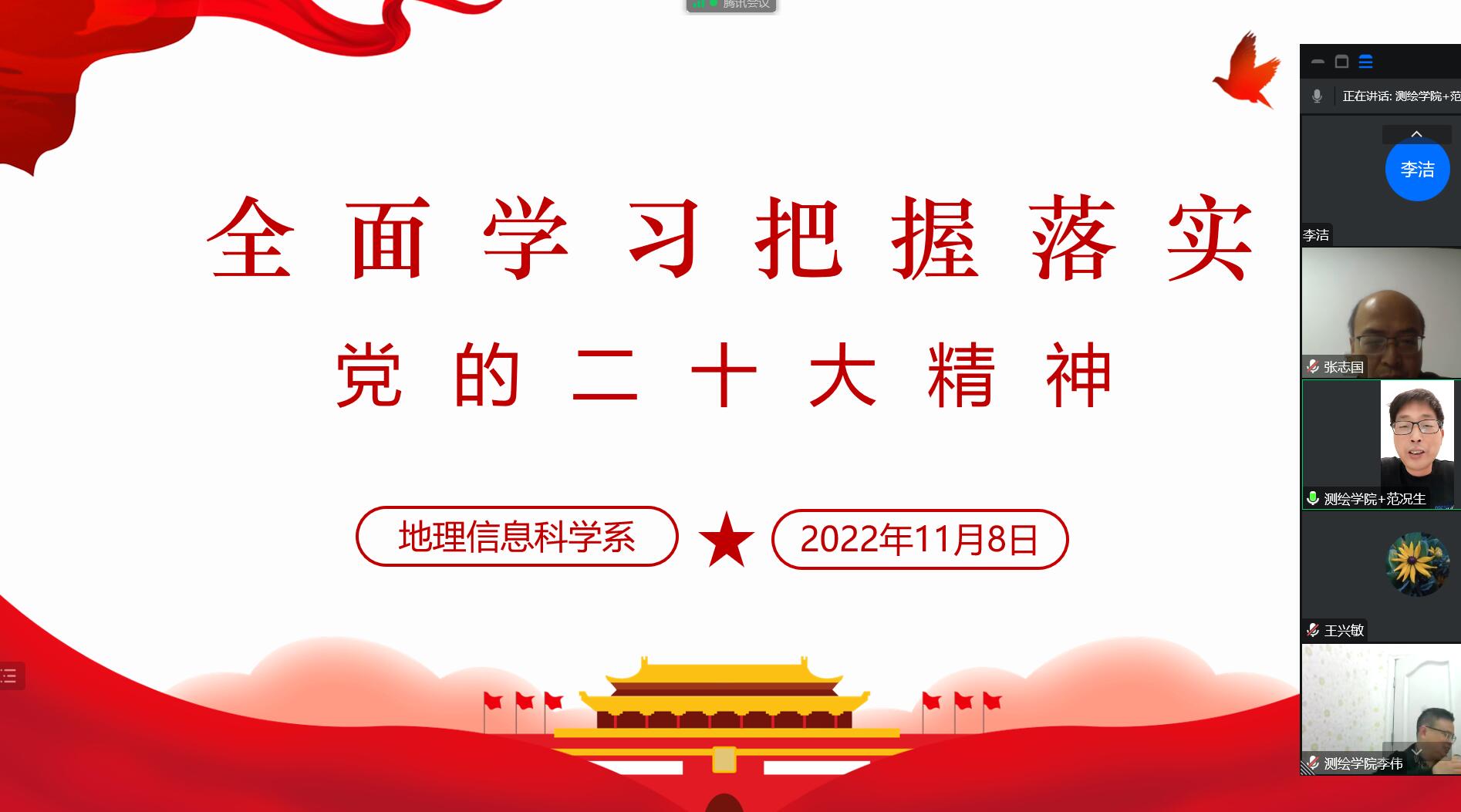 最后,大家深入交流,积极探讨如何把党的二十大精神与专业课课程思政有机结合起来,以确保党的二十大精神在GIS专业落地生根、开花结果。