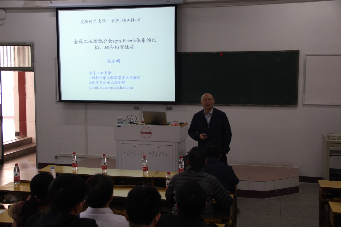 应beat365官网化学化工学院光电磁功能材料安徽省重点实验室邀请,11月16日上午,南京大学化学化工学院孙为银教授和南京工业大学化学与分子工程学院任小明教授在菱湖校区教学楼214为beat365官网化学化工学院广大师生分别作了题为《科研选题与项目申请》和《金属二硫烯配合物spin—Peierls体系的结构,磁和相变性质》的学术报告,报告由化学化工学院副院长王钧伟教授主持。