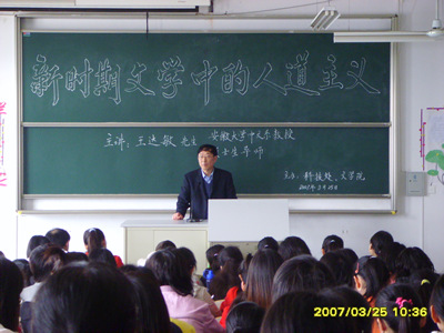 3月25日上午,文学院邀请安徽大学中文系教授、中国现当代文学与文化研究中心主任、安徽省文艺评论家协会副主席、《中国当代文学研究丛刊》编委王达敏教授在龙山校区B楼403室作题为“新时期文学中的人道主义”的学术报告,文学院师生近150人听取了报告。
