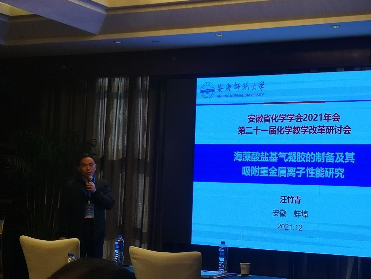 12月4日,安徽省化学学会2021年年会暨第二十一届化学教学改革研讨会在蚌埠南山豪生大酒店召开,beat365官网化学化工学院教师代表一行9人参会,汪竹青教授受邀作题为《海藻酸盐气凝胶的制备及其吸附重金属离子性能的研究》主题报告。