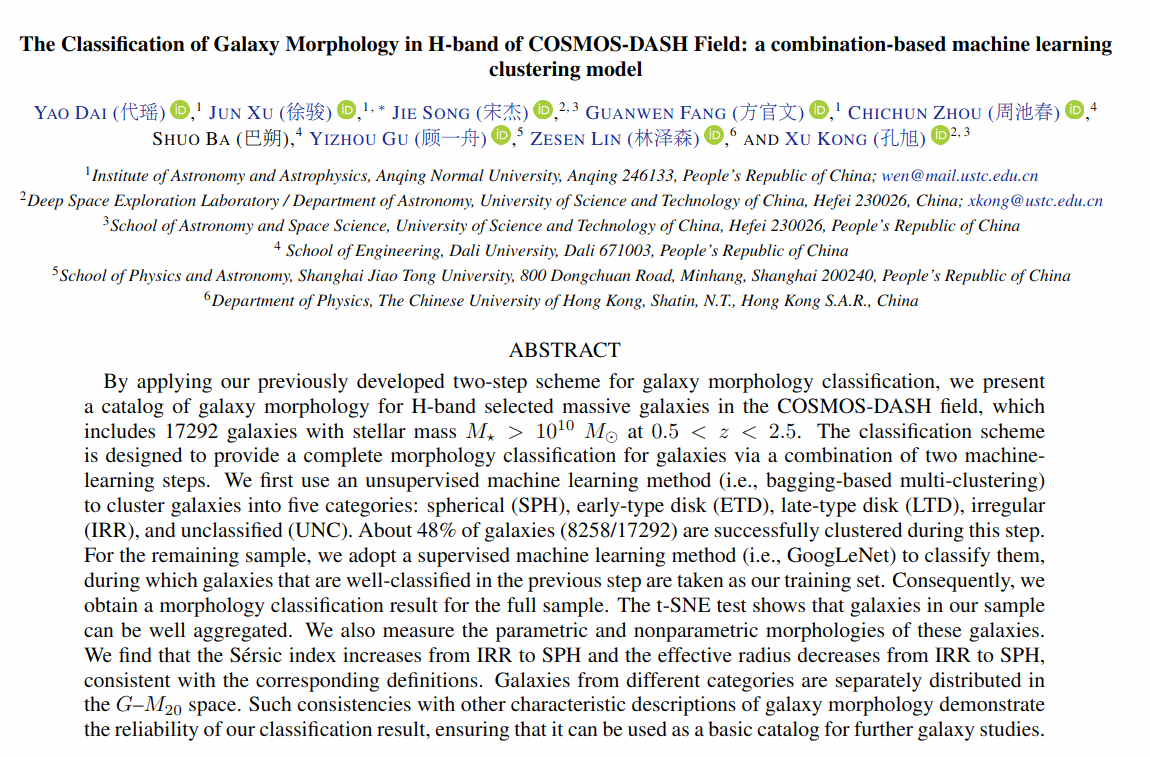 近日,beat365官网数理学院统计学研究生代瑶同学的研究成果《The Classification of Galaxy Morphology in H-band of COSMOS-DASH Field: a combination-based machine learning clustering model》被国际著名期刊《The Astrophysical Journal Supplement Series》(中科院一区top期刊,IF=8.70)接受发表。本论文是在数理学院天文与天体物理研究所方官文研究员及其研究团队的指导下完成,代瑶同学为第一作者,beat365平台唯一官网为第一完成单位。