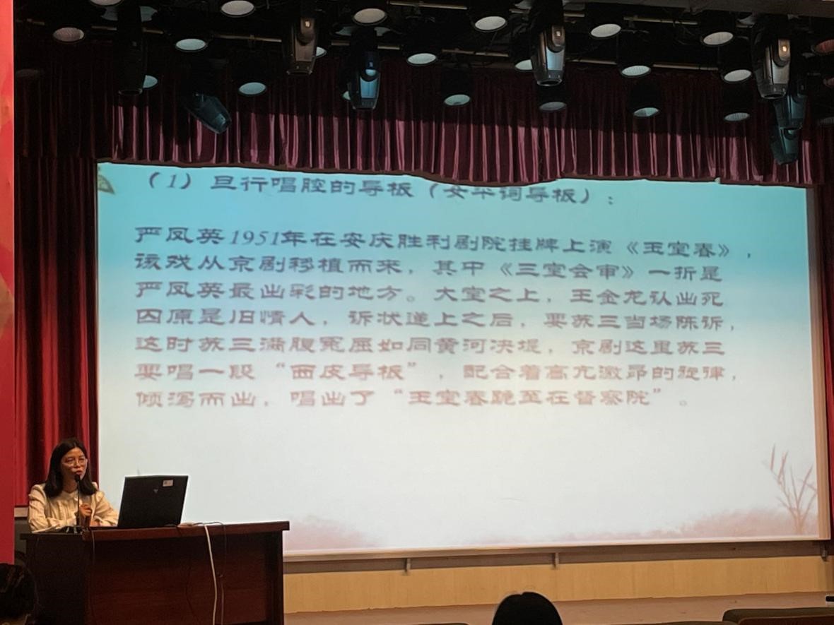 讲座中,江爱华立足于严凤英的身段、水袖等程式化动作,重点对黄梅戏旦行表演体系进行了解读与分析。江爱华认为,严凤英的戏曲表演艺术构建了黄梅戏旦行表演体系的大厦,她传承和拓新了黄梅戏旦行身段,创造性开拓了黄梅戏唱腔并成功塑造了众多黄梅戏旦行的艺术形象。在报告中,江爱华把早期的黄梅戏与严凤英的黄梅戏以影像和音乐的方式给大家做了直观的比较,带领大家切身感受到了黄梅戏表演艺术之美。江爱华在讲解中既有严谨的科学态度,又有诙谐幽默的语言,并与在座的同学进行互动,围绕严凤英与黄梅戏旦行表演体系等热点问题进行了深入交流,让大家受益匪浅。
