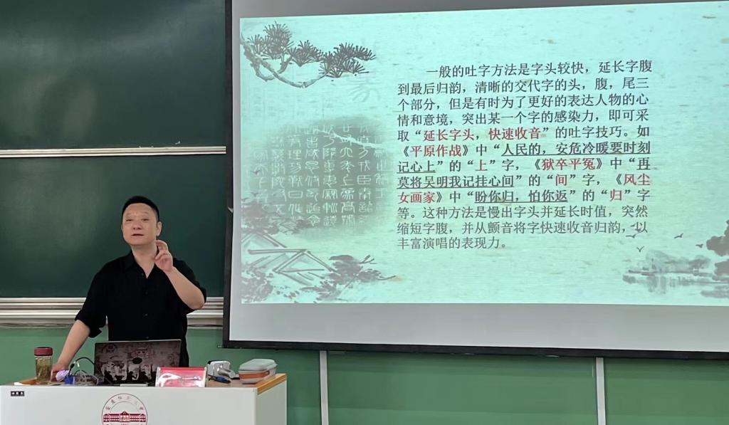刘老师以地道的安庆官话开场,指出语言和声腔既是区别戏曲剧种的主要标准,也是戏曲角色创造的重要手段。黄梅戏语言的民间性与通俗性,经过艺术加工和提炼,具有非常独特的人文底蕴和艺术魅力,还能启智增慧,具有立德树人的思政功效。讲座中,刘老师讲唱结合,通过大量黄梅戏经典唱段的语言解析与演唱示范,深入浅出地说明了安庆方言与黄梅戏艺术魅力的密切关系,黄梅戏平词、花腔、彩腔等不同声腔板式的语言特点、演唱方法与审美趣味,以及黄梅戏的剧种弹性与包容性。刘老师强调,黄梅戏演唱语言虽以安庆官话为基础,但也必须有所取舍。特色并非都是特长,不能也不应该因为强调地方特色就把一些生僻难懂的语言语汇搬上舞台,这样会堵塞演员与观众的交流,导致剧种地域局限而束缚自身的发展。