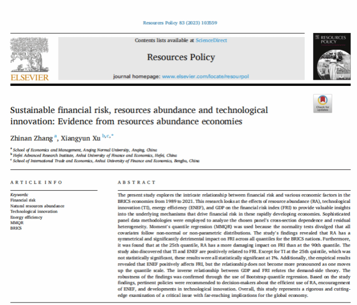近期,经济与管理学院金融工程教研室张支南老师以第一作者身份,在SSCI一区TOP期刊《Resources Policy》上发表了题为《Sustainable financial risk, resources abundance and technological innovation: Evidence from resources abundance economies》的学术论文。该刊由Elsevier国际出版社出版,聚焦与资源生产和使用有关的经济和政策问题,2022年综合影响因子为8.222,属于中科院分区经济学大类的TOP刊物。