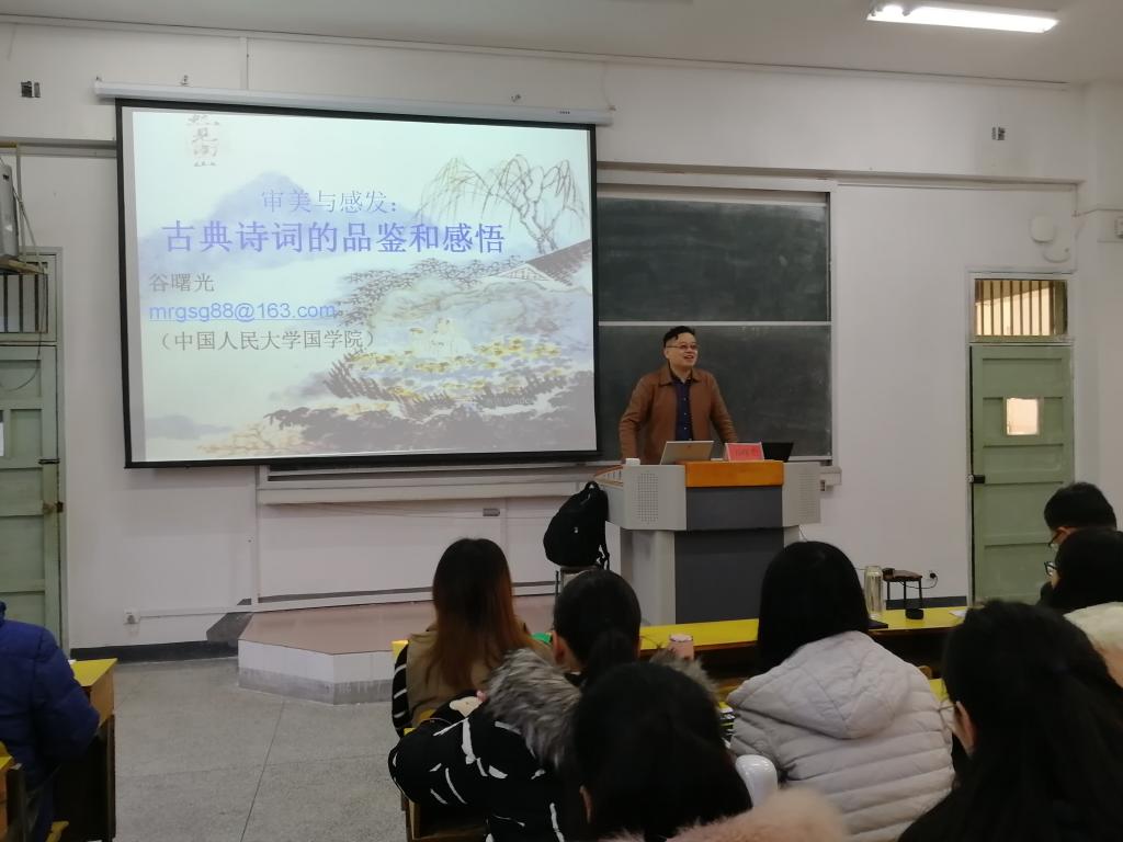 12月11日上午,中国人民大学国学院教授、博士生导师谷曙光教授于教学楼315教室为文学院做了一场题为“审美与感发:古典诗词的品鉴和体悟”的学术讲座。讲座由文学院院长汪祚民教授主持,文学院研究生与本科生一百余人参与此次讲座。