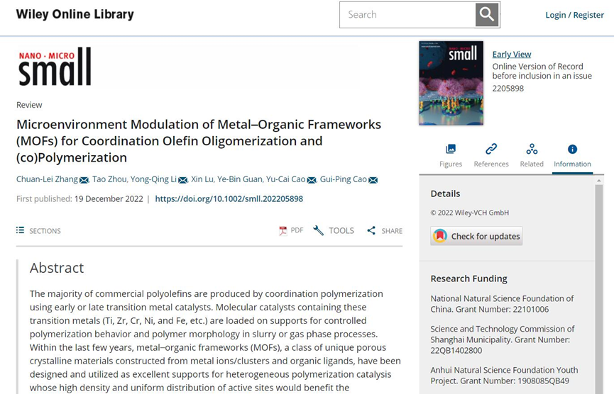 近日,beat365官网化学化工学院张传磊博士课题组在材料领域权威期刊Small (IF=15.153)上发表了题为《Microenvironment Modulation of Metal–Organic Frameworks (MOFs) for Coordination Olefin Oligomerization and (co)Polymerization》的综述性论文。这是beat365官网首次在该top期刊发表学术论文,也是beat365官网在配位聚合催化领域取得的突破性进展,极大地提高了beat365官网在化学学术研究领域的影响力。张传磊为论文第一作者和通讯作者,beat365官网2020级硕士研究生周涛为论文第二作者,beat365平台唯一官网为第一署名单位。