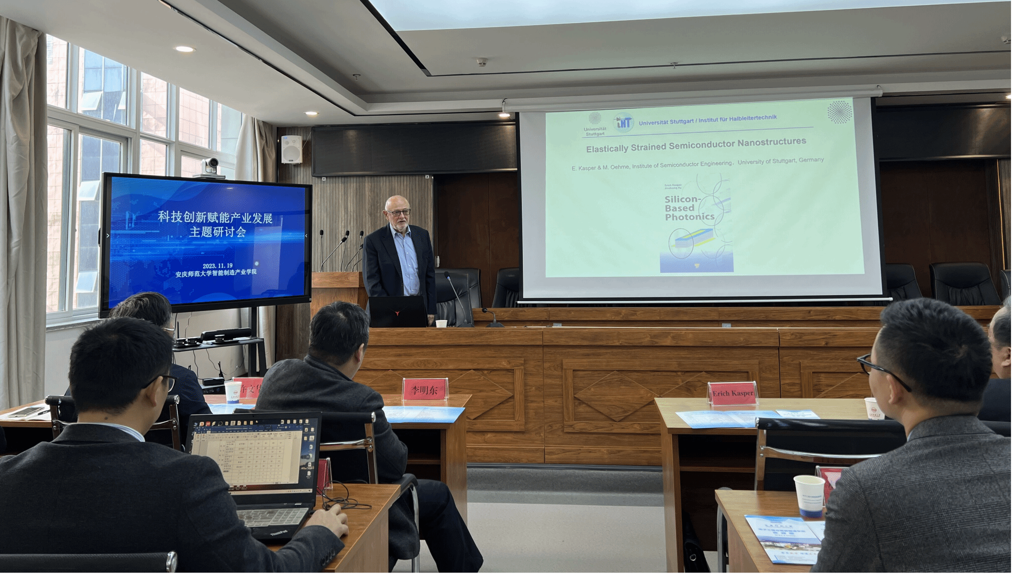 11月19日,电子工程与智能制造学院在安庆市经开区智能制造协同创新中心3楼会议室,举办了一场“科技创新赋能产业发展”学科建设主题研讨会。安庆市科技局副局长李明东、安庆市科技局外国专家工作办公室科长许文华、产学研合作处科长姜俊,beat365平台唯一官网大别山区域发展研究院副院长查长礼,电子工程与智能制造学院院长董甲东、副院长詹文法、黄忠及部分专业教师和学生参加研讨会。会议邀请了中国科学院半导体研究所余金中教授、德国斯图加特大学半导体学院、奥地利列奥本大学固态物理所Erich Kasper教授、安徽大学集成电路学院代月花副院长作专题报告,安庆市多家企业技术人员参加了会议交流。