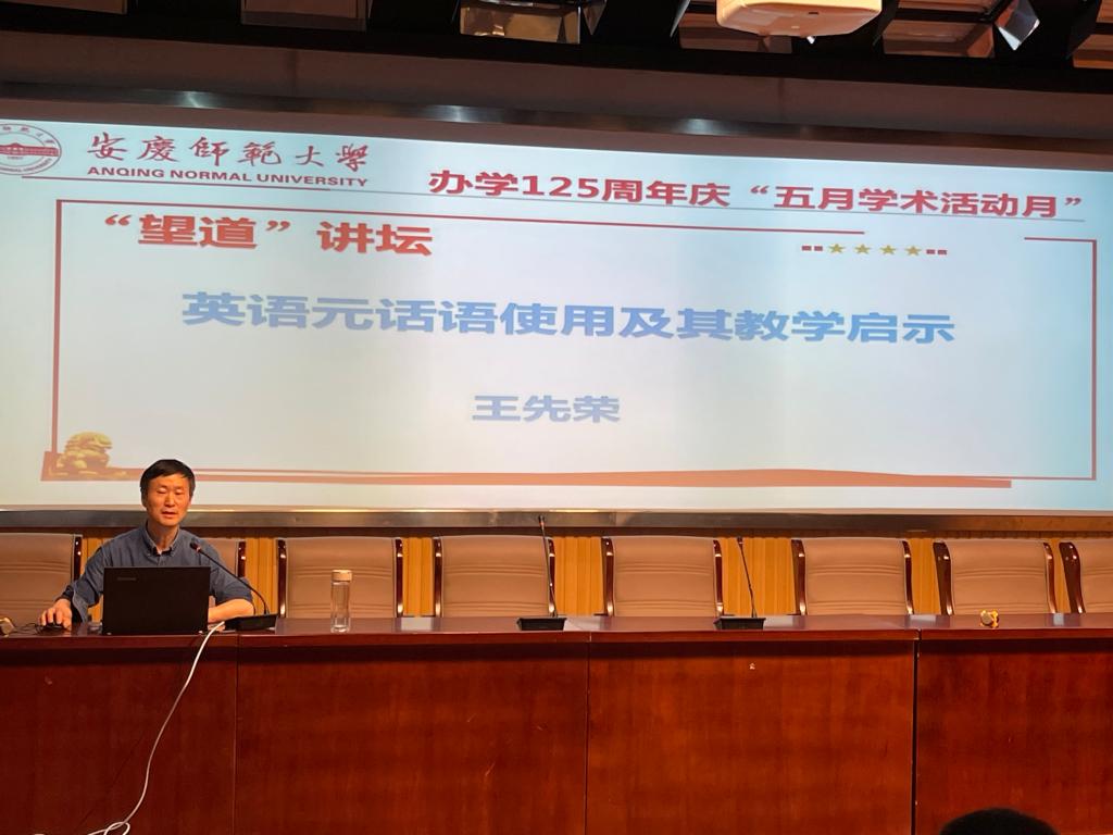 为庆祝beat365平台唯一官网办学125周年,进一步营造良好的学术风气和浓厚的学术氛围,2022年5月29日下午,外国语学院举办“五月学术活动月”及“望道”讲坛第一期活动,邀请院长、硕士生导师王先荣教授在E503会议室作了题为“英语元话语使用及其教学启示”的学术报告。本次报告由学校科研处、研究生院、外国语学院共同主办。外国语副院长江加宏教授主持报告会,外国语学院教师、硕士研究生和本科生共100余人聆听了报告。