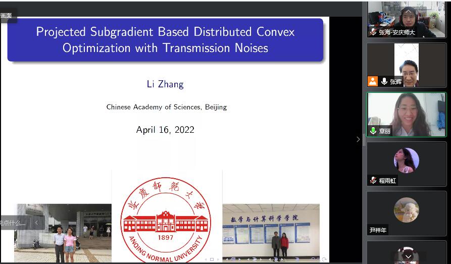 4月16日上午,中国科学院系统科学研究所章丽博士后应数理学院邀请作了一场题为“Projected subgradient based distributed convex optimization with transmission noises”的线上学术报告。数理学院副院长张海教授、部分教师、硕士研究生以及高年级本科生参加了报告会,报告会由张海教授主持。